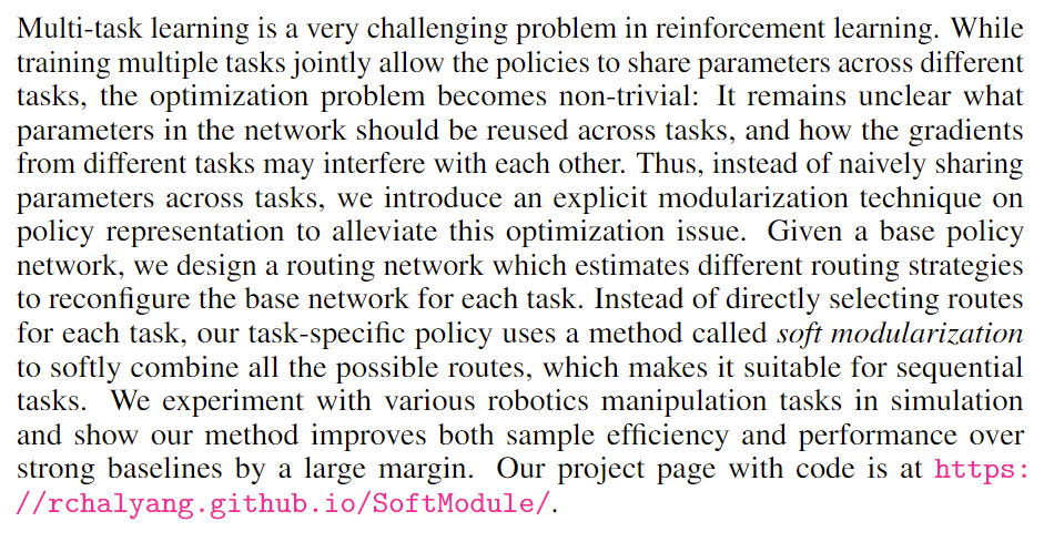 在多任务强化学习中,因为任务的性质和难易不同,在利用一个模型同时训练多个任务时,往往会出现相差较大的任务梯度冲突,容易的任务先达到收敛等问题。目前解决这些问题的方法有知识蒸馏(即学多个任务policy之后蒸馏给一个policy),梯度修剪(即在计算不同任务梯度时按照投影方向更新等),progress网络(好像是增量式的学任务,增量式的加网络),还有pathway类(即本文这种,通过激活不同的模块来增加网络的容量)。
