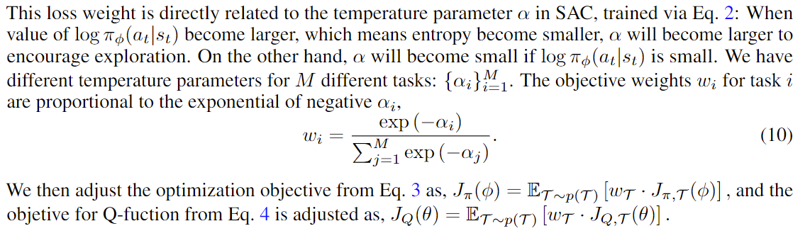 这里利用SAC中衡量策略熵的alpha来判断当前任务的难易程度(难得任务更难收敛,所以熵会更大),然后对policy loss里面不同任务进行一个加权处理(类似梯度修剪,VMPO等,就是让简单的任务等等难的)。