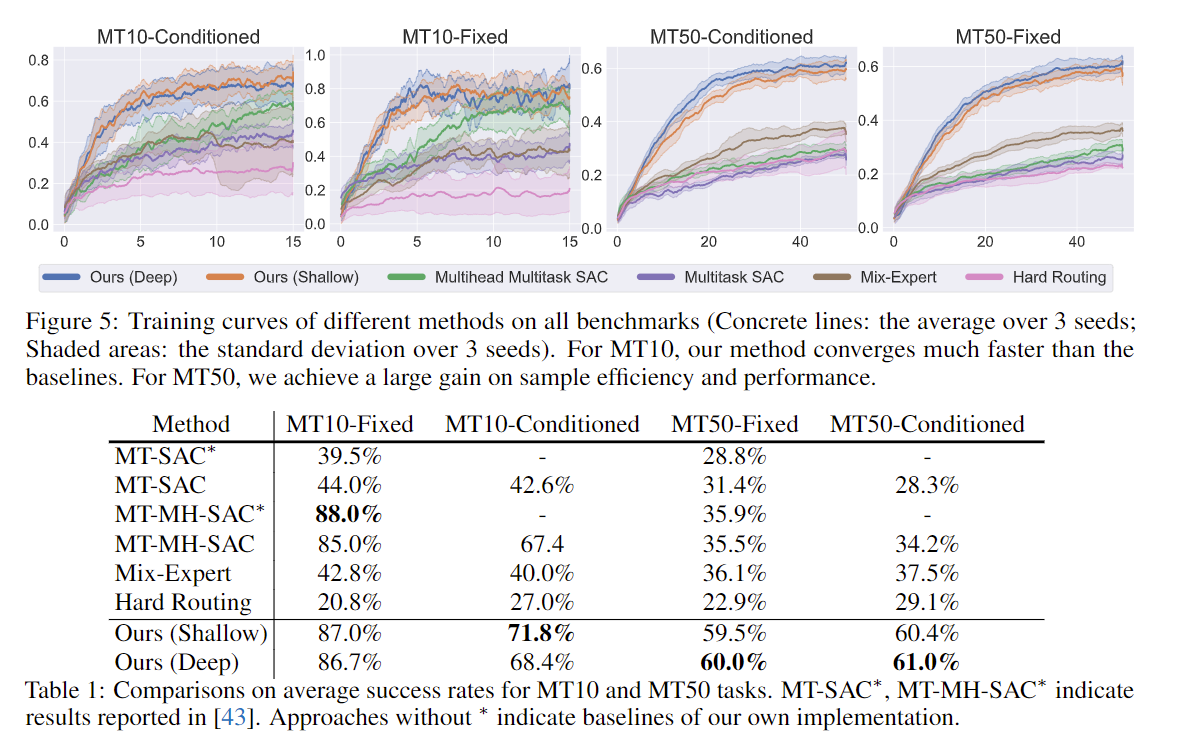 从上面两个图片中的网络结构可以看出,网络方面的主要工作大约有两点:1. 学习一个多层级且每个层级有多个模块的base 网络(这里的一个模块可以是很多层网络,输出也是多维) 2. 学习一个分配不同模块间权重的routing网络 (注意到base网络的输入是通用的环境状态(与任务无关),而routing网络的输入是包含任务特有信息的)。这里也是因为meta world这个任务是在相同环境下相同物理动态信息下的不同任务,所以base网络可以学习基础通用的信息,然后利用routing网络来进行特定task的调整。